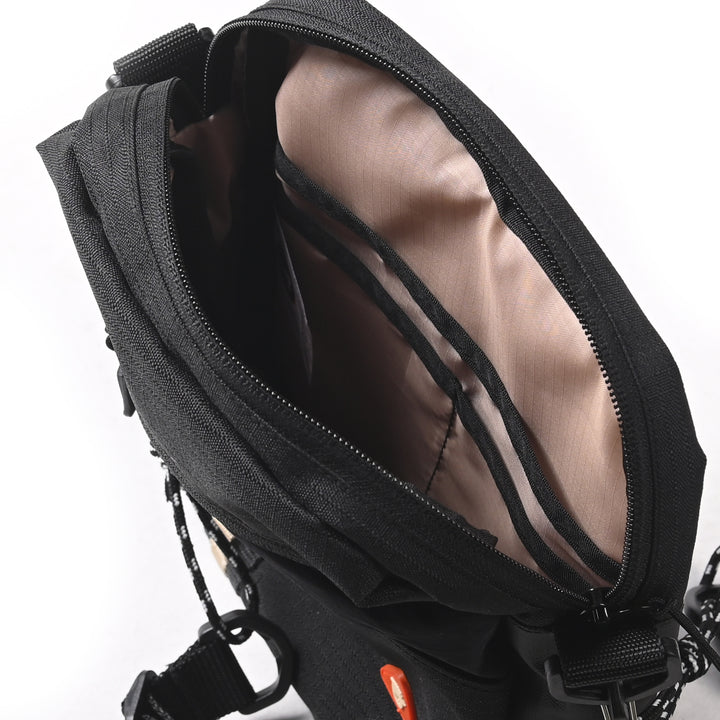 A modern sling bag designed for carrying daily tech essentials up to 11 inches. Features external webbing for seamless customization with other small pouches and gear, along with a quick-access front pocket. An ideal companion for the modern urban explorer, combining a sleek design with practical functionality.